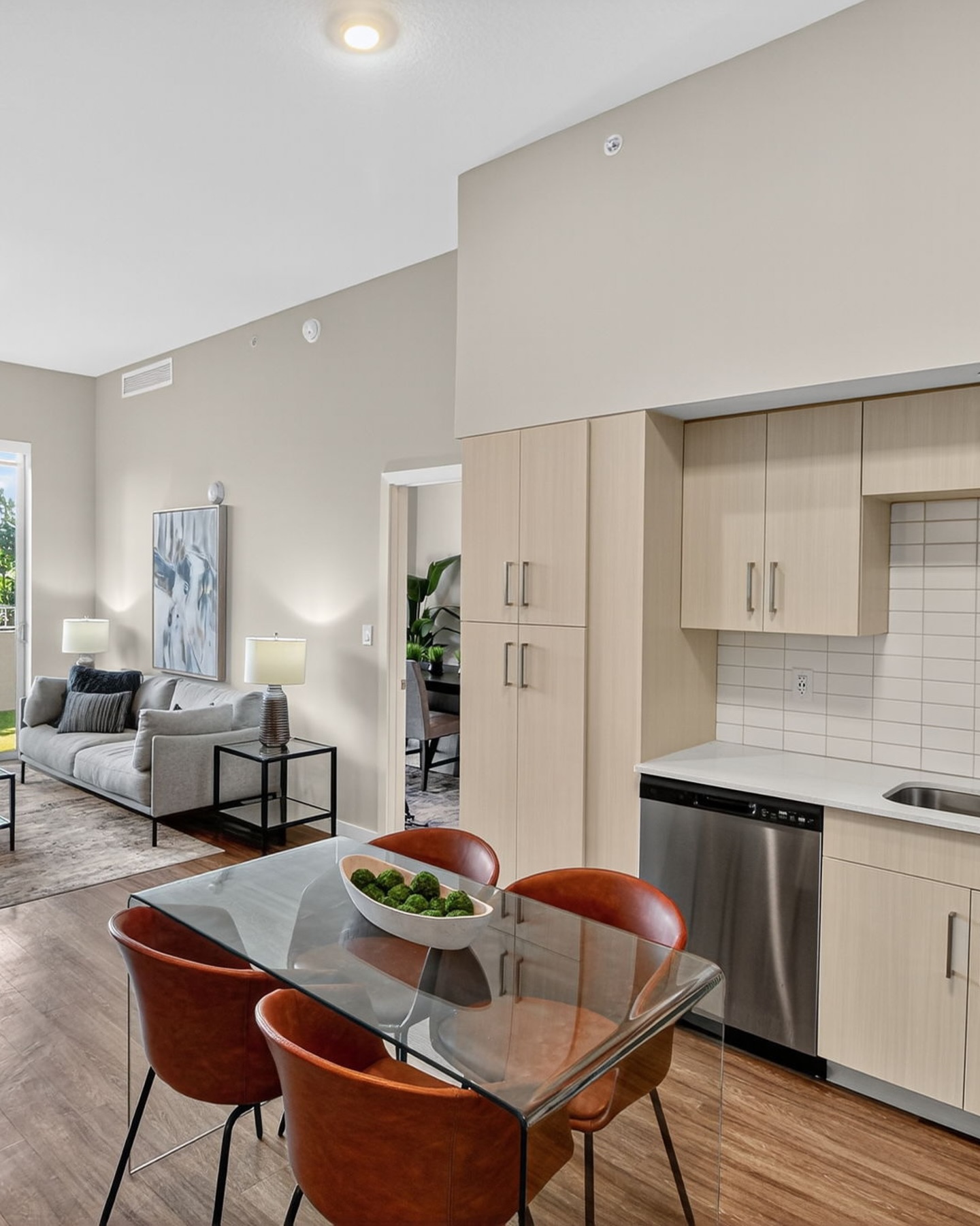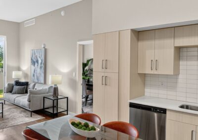 Centralis Residences offers contemporary one- and two-bedroom designs designed for efficient and comfortable urban living, with floor areas ranging from 622 to 1,057 square feet. Each unit features open-concept kitchens finished with quartz countertops, integrated appliances, in-unit washers and dryers, and luxurious wood-style flooring that unifies the spaces. Approximately 9-foot ceilings provide a sense of spaciousness and light; bedrooms include blackout drapes for privacy and relaxation. Private balconies provide views of the city or sunset over the pool, adding functional and aesthetic value to each residence.