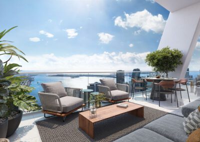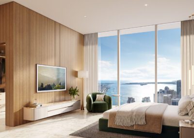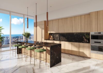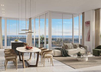 Adicionalmente, sus 163 condominios de uno a cuatro dormitorios presentan diseños a medida, ventanales de piso a techo que capturan vistas panorámicas de la bahía y el skyline de Miami, domótica avanzada para control de iluminación y climatización, cocinas de diseño italiano con electrodomésticos de alta gama, y baños revestidos en mármol importado.